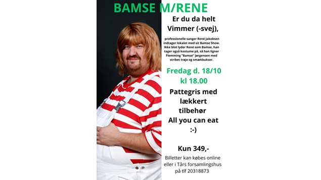 Fredag den 18. oktober kl. 18:00 bliver Tykskovvej 8 i Tårs centrum for en festlig aften fyldt med kendte hits og god stemning. René Jakobsen optræder med sit populære Bamseshow, hvor han hylder Flemming "Bamse" Jørgensen.