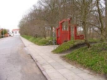 Ved den øst-vest-gående tværsti ses de røde “dyrehave”-porte, og indgangen ved Skolegaden sker gennem gitterporte mellem mursøjler.
