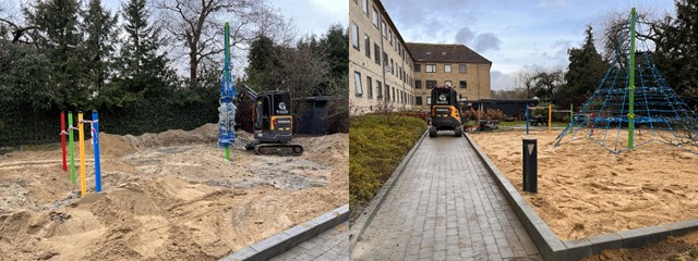Til venstre ses et "førbillede" af udførelsen af en legeplads, og til højre ses det færdige resultat (Foto: Privat)