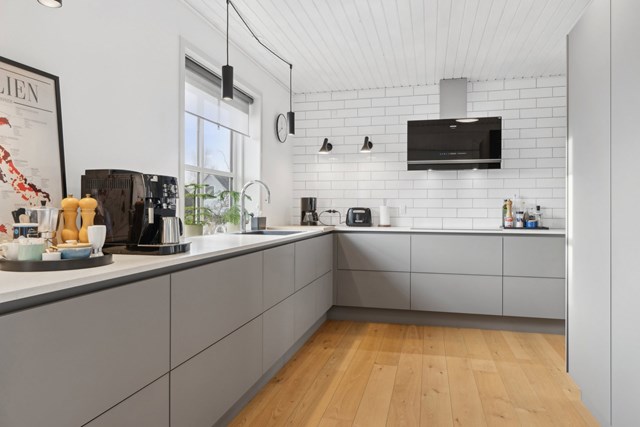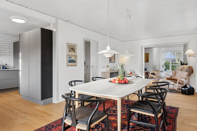 Villaen fra 1955 er grundigt vedligeholdt, og de seneste år har også stået på betydelige opdateringer. I 2021 blev der installeret et stilrent køkken fra Svane med topmoderne hvidevarer fra Neff, Miele og Siemens, og både badeværelset og toilettet blev udstyret med tilsvarende Svane-elementer. Ligeledes blev der lagt nyt gulv af egetræsparket i køkken-alrummet, og også udendørsbelægningen fik nyt liv i forbindelse med kloakseparering.
