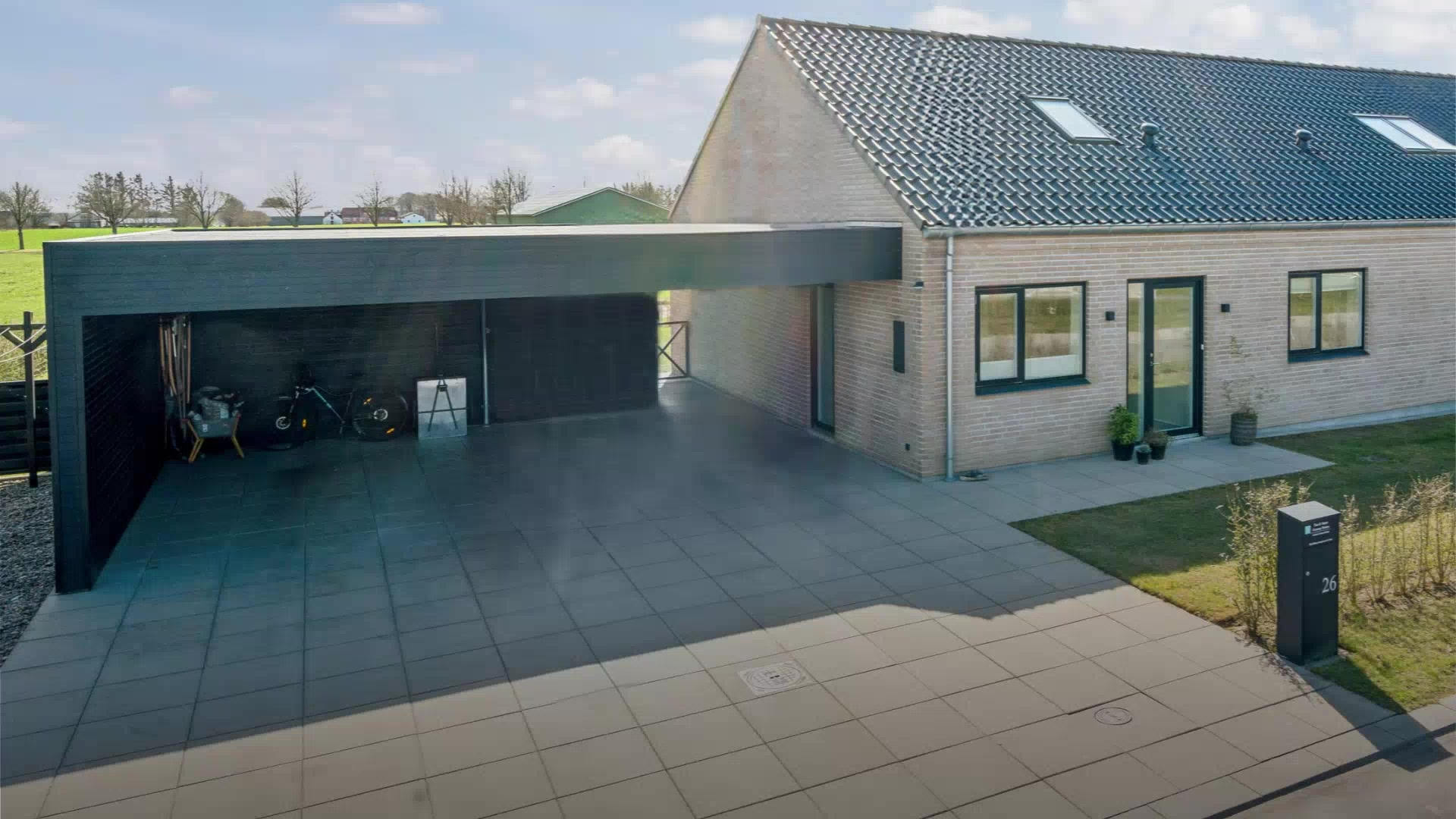 Udover beboelsen er her skøn dobbelt carport, god indkørsel med plads til adskillige biler samt et godt isoleret udhus/værksted.