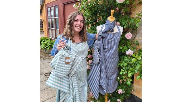 Stine viser her den fine køkkenserie fra Engholm Textiles - Genbrugsbomuld