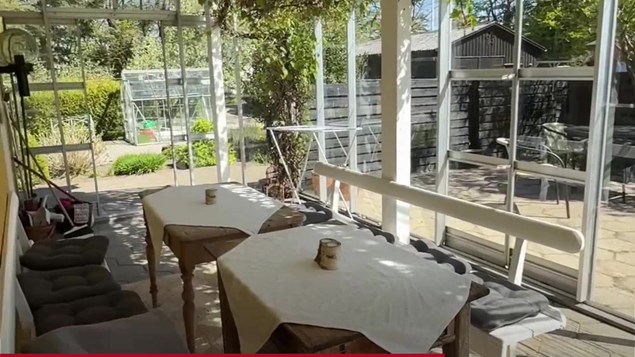 Fra stuen og bryggers er der udgang til overdækket terrasse i dag indrettet som hyggelig udestue med udgang til en gårdhave.