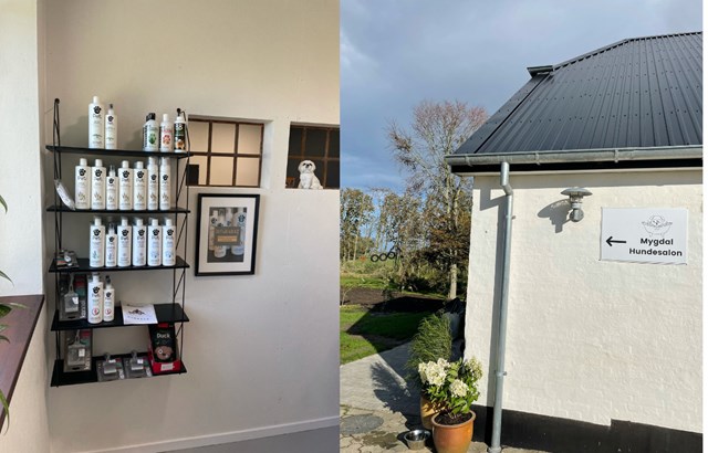 Foto: Privat // Pelsplejeprodukter (t.v.), Indgangen til salonen (t.h.)