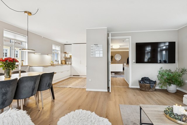 Facaden er lige såvel som det indre malet i nyere tid, og det giver et rigtig flot førstehåndsindtryk. Inden døre bliver de høje forventninger også indfriet, for her er flere af gulvene skiftet i 2024-2025, og køkkenet er også fra 2024. Det er Invita, der har stået for de pæne løsninger, og opbygningen er funktionel med lækre hvidevarer fra Miele. Køkkenet er åbent til alrummet og stuen, og lysindfaldet fra tre verdenshjørner gør noget utroligt godt for rummet.