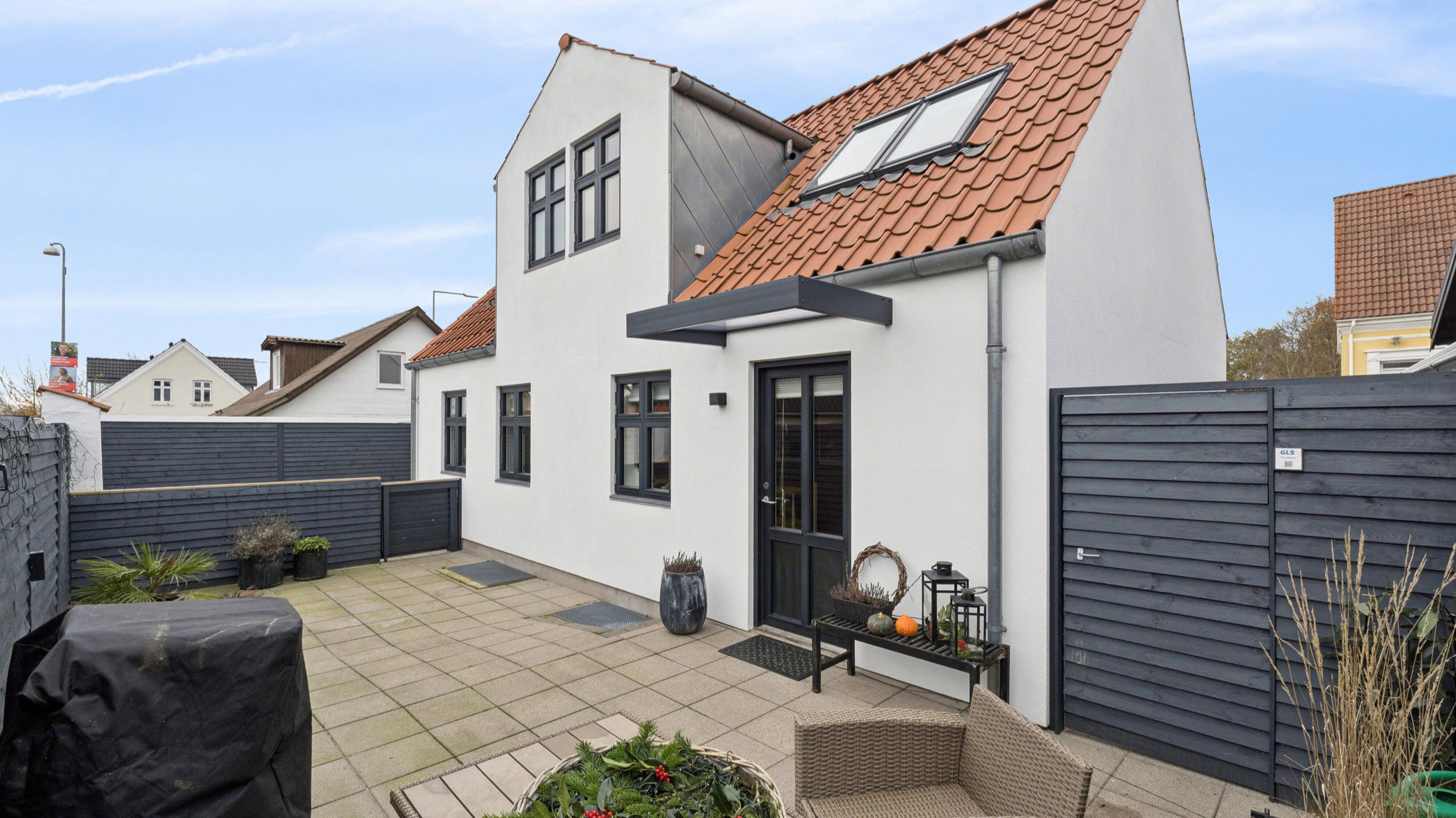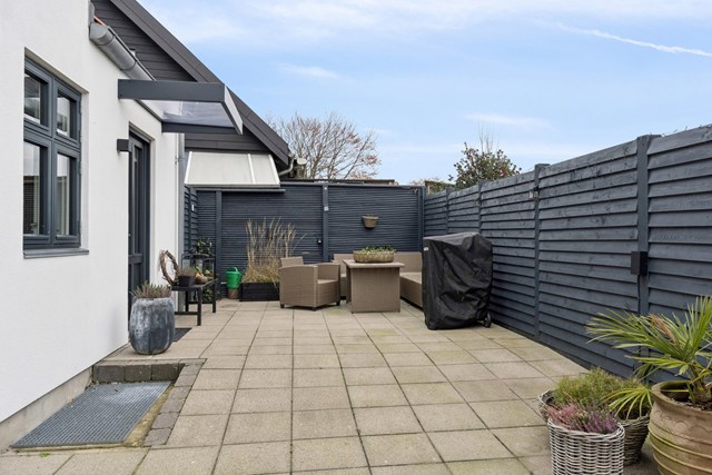 Der er flisebelægning omkring hele huset, så det er let at finde flere pladser i det fri. Bag huset er der en dejlig gårdhave, som er fint afskærmet af hegn, hvilket gør det til et særligt attraktivt sted at tage plads, og det vender godt for solen.
