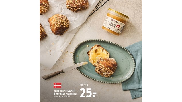 Hos SPAR har vi glæden af at tilbyde Jakobsens danske blomsterhonning. Honningen er 100 % dansk og indsamlet fra bier, der har besøgt blomsterenge rundt om i Danmark. Det giver honningen dens unikke og milde smag, som både store og små elsker Og med SPAR's lokale butikker over hele landet, er vi altid lige i nærheden, klar til at byde dig velkommen til en smag af Danmark