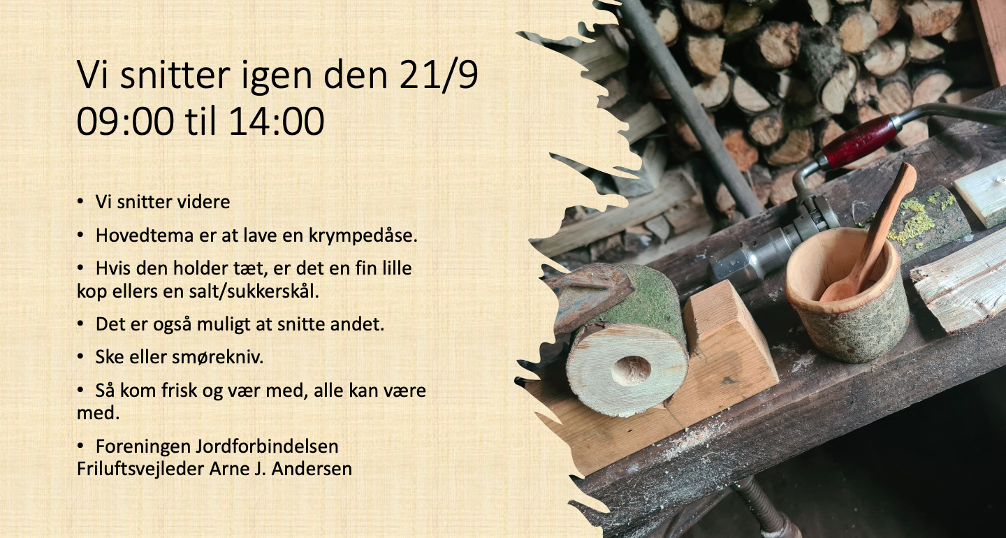 Så trænger du til at komme ud i naturen og er du måske lidt interesseret i at lave at snitte funktionelle redskaber fra skovens grene, eller bare haven, så tilmeld dig "Snit en krympekop". Tilmelding kan ske her. Udover tilmelding er budskabet enkelt fra formand i Foreningen Jordforbindelsen, Carsten Hjerresen: