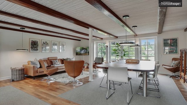 Huset er nænsomt gennemrenoveret, og I kan se frem til en ejendom på hele 308 m2 fordelt på to etager med gulvvarme, der indeholder to stuer, et køkken-alrum, fem værelser, to badeværelser og et bryggers. Det hele varmes billigt op af jordvarmeanlægget, der blev installeret i 2017. Køkken, bad og bryggers blev istandsat i 2015, mens ladens tag og vægge blev opdateret 2016-2021.
