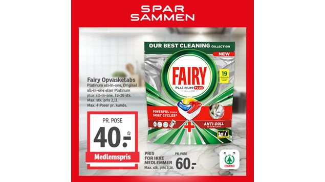 Du finder Fairy Opvasketabs i butikken lige nu til 40 kr.
