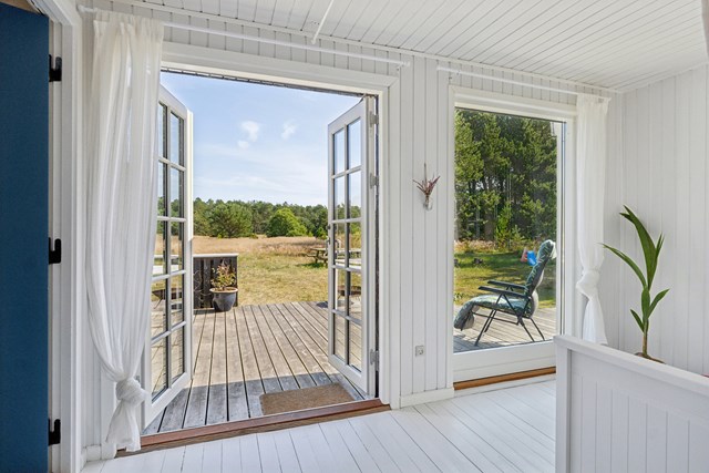Rundt om store dele af huset strækker sig en terrasse, der vender mod både syd og øst og giver gode muligheder for ophold ude i det fri. I er nærmest omsluttet af den vilde natur, og både roen og udsigten er derfor også af en helt særlig støbning.