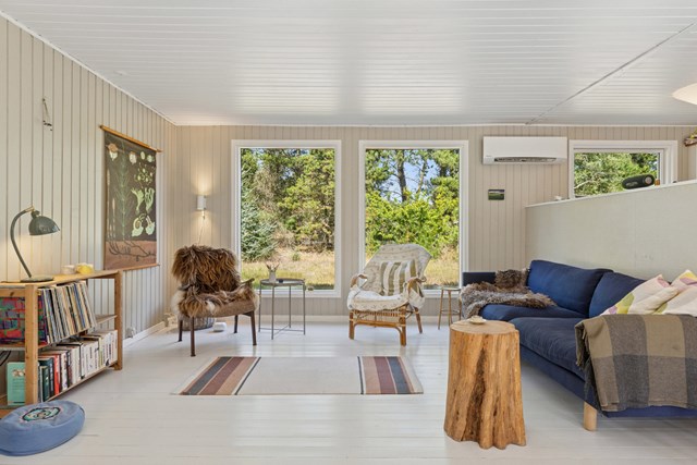 Det videre rumforløb leder til stue nummer to, og herpå følger fire værelser og to badeværelser. Der er således rig mulighed for at have både familie og venner til at overnatte. Alle som én vil værdsætte den hjemlige, afslappende og nordiske atmosfære, som skabes ved at kombinere hvidmalede lofter og gulve med vægpaneler og småsprossede vinduer.
