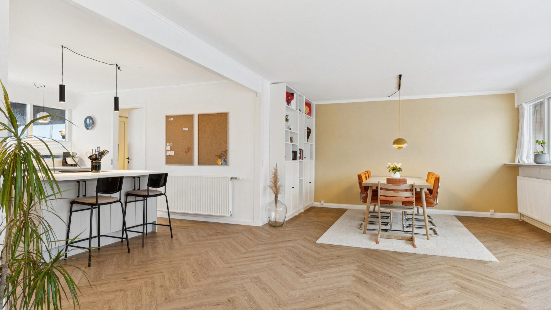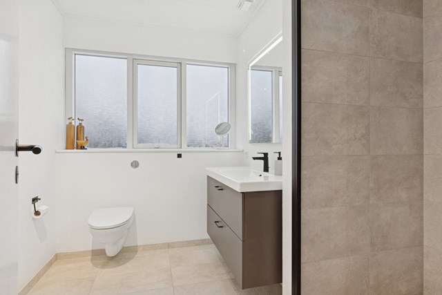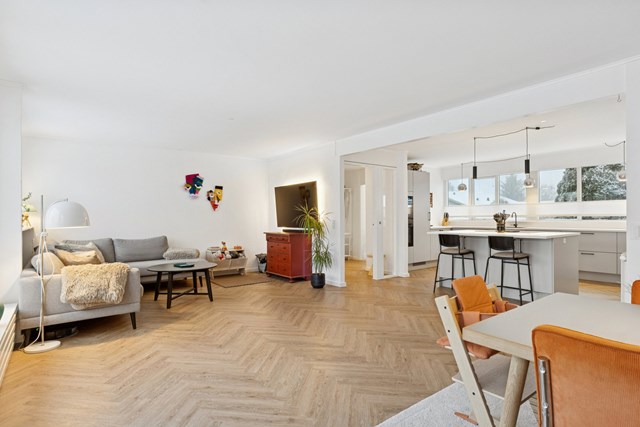 De enorme vinduer giver et fantastisk lysindfald, som fremhæver det smukke sildebensgulv i opholdsmiljøet, hvor køkkenet og stuen forenes. De store glaspartier vender mod sydvest, og i samme retning er der udgang til terrassen. Modsat troner det lyse Invita-køkken, hvor kogeøen har plads til et par barstole, og der er en dejlig sammenhæng med den resterende del af opholdsmiljøet. Fra køkkenet er der adgang til bryggerset, som foruden vaskefaciliteterne har fin plads til opbevaring.