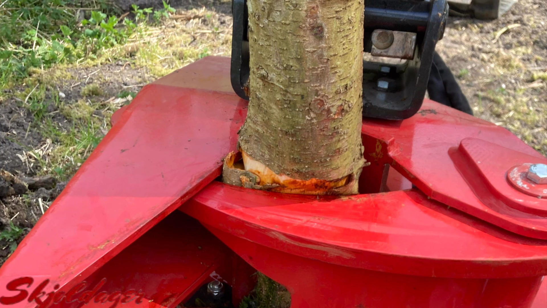 Træfældning er nemt med det nye fældehoved fra Tontec Aps til minigraveren