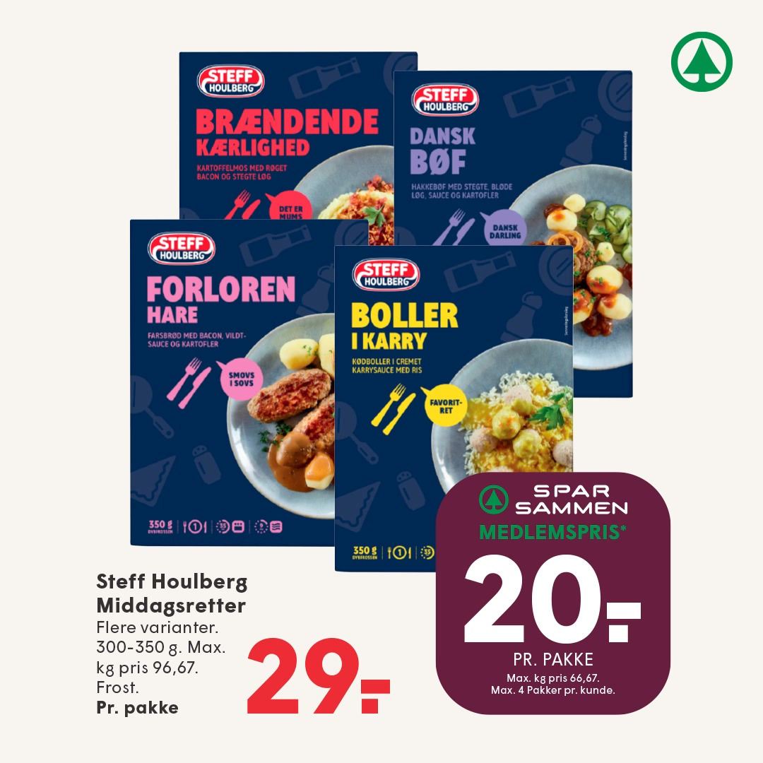Hurtig og nem aftensmad? Steff Houlberg middagsretter 20 kr. Spar 9 kr. med fordelsappen SPAR SAMMEN til og med torsdag d. 16. april 2026.