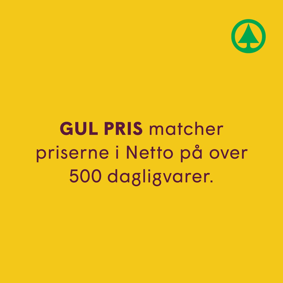 Med GUL PRIS matcher vi priserne i Netto på over 500 hverdagsvarer. Kig efter det gule mærke i butikken – så ved du, at du får discountpris.