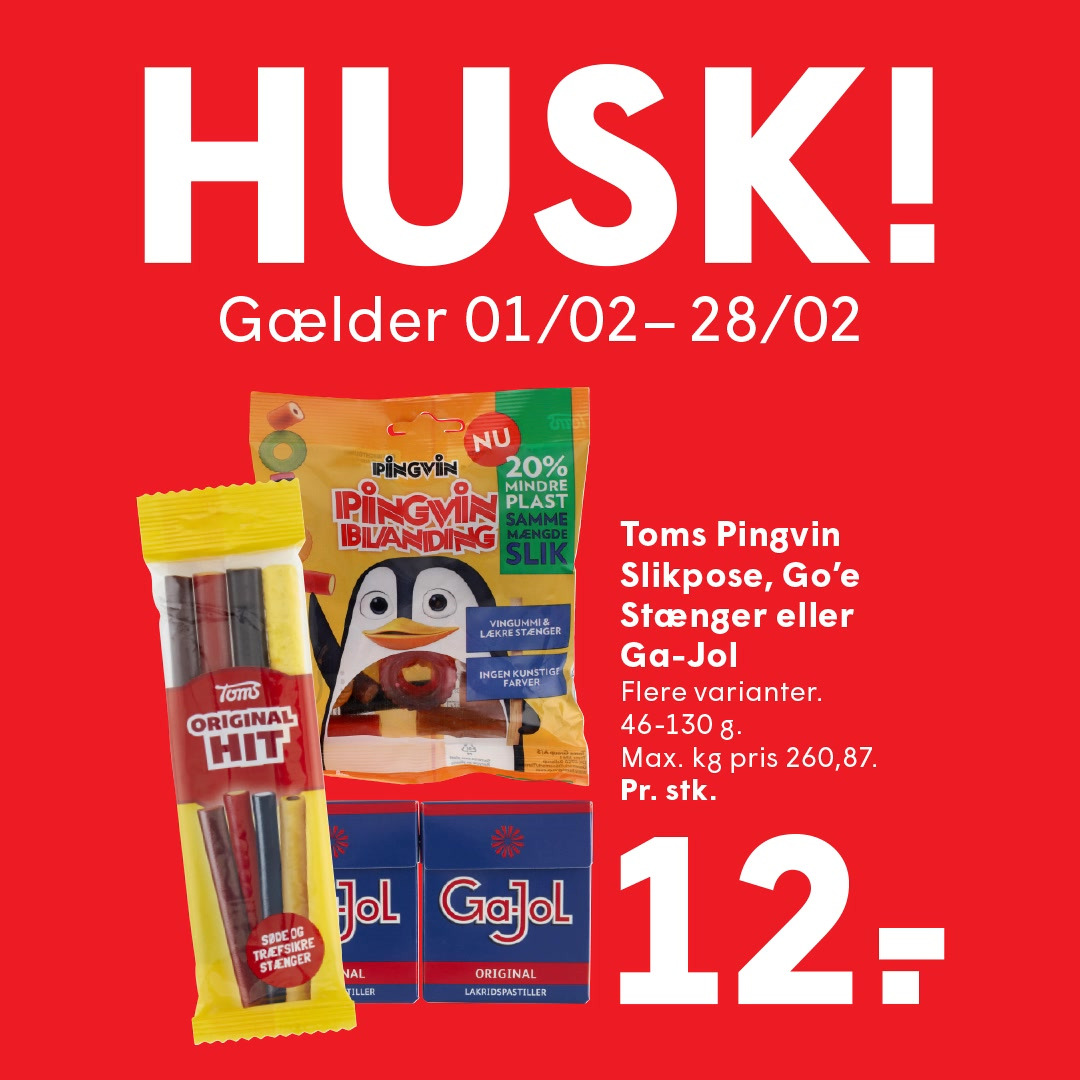 Her får du bl.a. et lækre Toms Pingvin Slikposer til 12 kr. ... og meget andet godt!