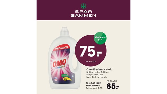 Er du løbet tør for vaskemiddel? Du sparer 10 kr. på Omo flydende vask med fordelsappen SPAR SAMMEN til og med torsdag d. 17. juli 2025.