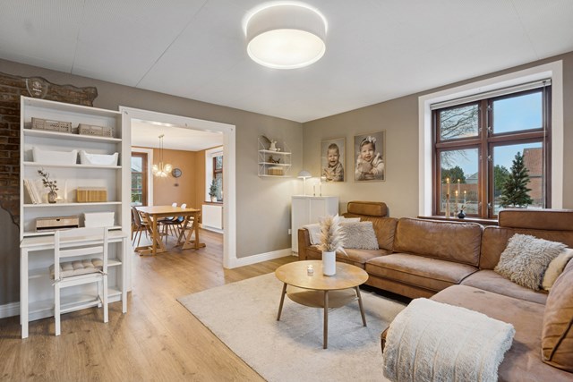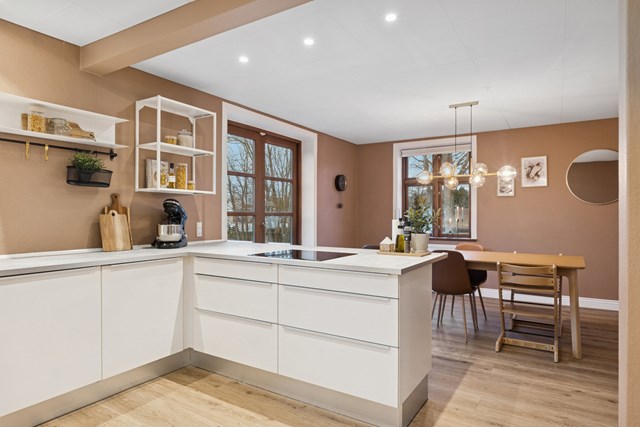I smiler så snart, I træder ind i det åbne opholdsmiljø, hvor køkkenet troner i et nordisk look, der står smukt til de flotte gulve og de elegante farvetoner på væggene. Kogezonen er orienteret ud mod alrummet, hvor brændeovnen fra 2021 kan skabe stemning med en knitrende lyd under måltiderne. Der er åbent til stuen, og herinde skaber de blotlagte mursten lidt ekstra charme.