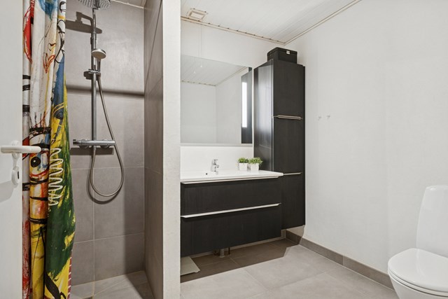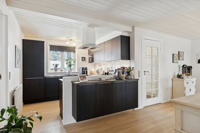 Start i opholdsmiljøet, hvor køkkenets sorte HTH-elementer står som en flot kontrast til det lyse rum. Dele af arbejdsfladerne vender ud mod alrummet og stuen, så det er let at fortsætte samtalerne på tværs af aktiviteter. Halvvæggen og den delvise opdeling mod stuen skaber hyggelige forudsætninger i indretningen. I får samtidig to værelser, og det giver jer en fin fleksibilitet, hvor I foruden soveværelset kan have plads til det hjemmeboende barn, et kontor eller måske overnattende børnebørn. Endelig byder huset på et praktisk bryggers og badeværelset, som har en bruseniche.
