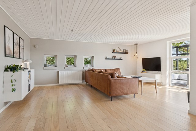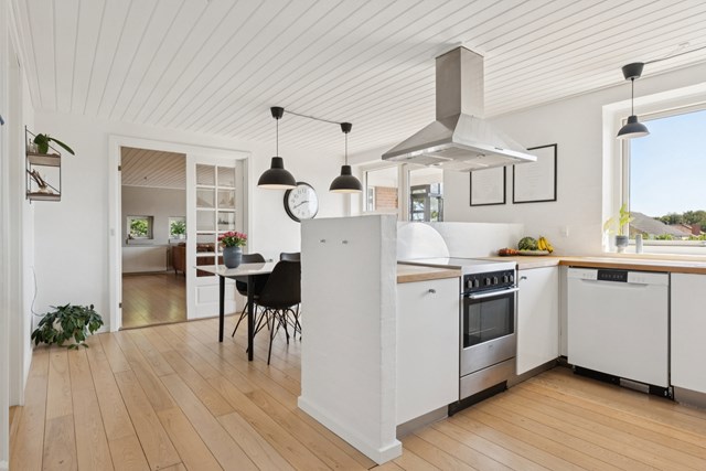 Inden døre udgøres hjerterummet af køkken-alrummet og en stue. Køkkenelementerne er tidløse, og pladsen er god. I forlængelse af den anseelige dagligstue har I orangeriet, som forlænger sommeren i begge ender, og både køkkenet og orangeriet har direkte udgang til terrassemiljøet. De resterende kvadratmeter indenfor er fordelt ud på tre værelser, et praktisk bryggers, et viktualierum og et badeværelse samt et gæstetoilet. De to sidstnævnte rum er flot renoveret i 2024 og har gulvvarme samt smagfulde elementer fra HTH.