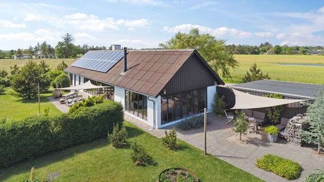 Solceller bidrager positivt til boligens økonomi, og i 2017 er der opført en garage med værksted samt dobbelt carport i sort træ. Med til herligheden hører en nem og solrig have.