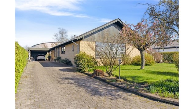 Ejendommen præsenterer sig flot med sin gule murstensfacade, der komplementeres af de mørke vinduespartier, tag og gavle. Til huset hører en carport med et godt udhus i forlængelse. Her parkeres bilen, inden I bevæger jer indenfor via det praktiske bryggers med opbevaringsplads og rum til vaskefaciliteterne.